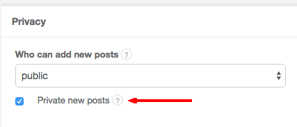 To set new posts as private by default (prior to admin review), go to Settings => Forum settings => Privacy.