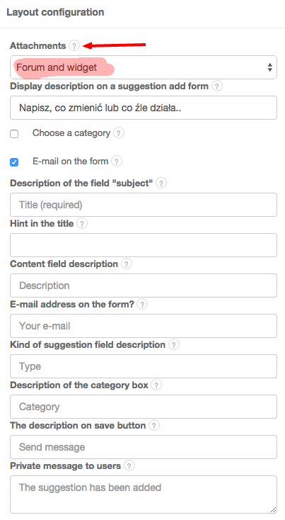 By default attachments can be added both on the forum and through the Suggestions Widget. If you want to change this setting, go to Settings > Forum configuration > Layout configuration. Attachments can be any files up to 10 MB.