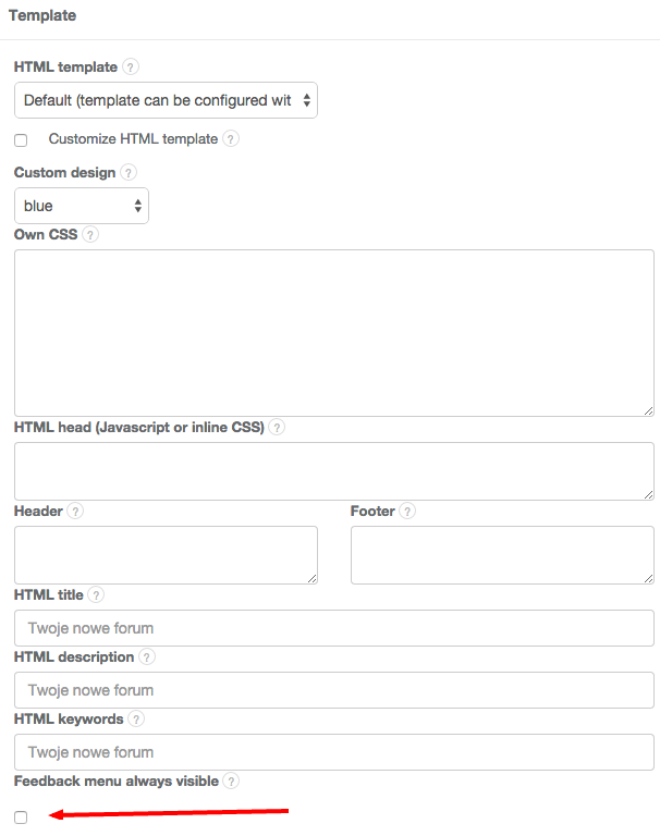 To toggle between the forum feedback visibility options, go to Settings > Forum settings > Template. By default the forum feedback menu is only displayed on the main forum page. If you toggle this option, the forum feedback menu will become visible on top of all forum pages.