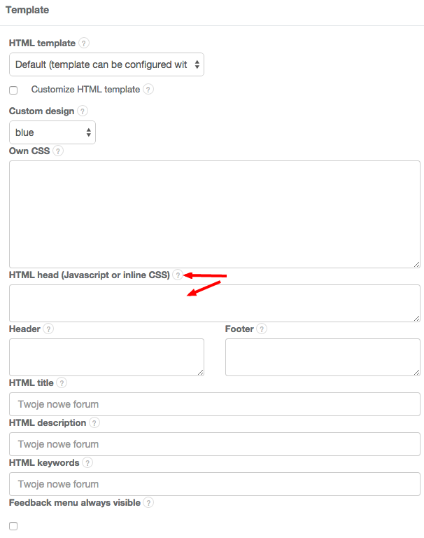 To change the HTML head section of your forum, go to Settings > Forum settings > Template. You can use Javascript and inline CSS in this section.