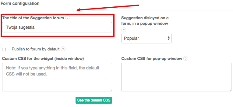 To change the forum name displayed on the Suggestions Widget, go to Settings > Forum Configuration > Site widget and write your title in the field provided.