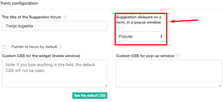 To change how submissions displayed in the widget are sorted, go to Settings > Forum Configuration > Site widget. Available options are New (sorted chronologically, newest to oldest), Popular (sorted by votes, most popular to least popular) and Disabled (submissions are not displayed in the widget).