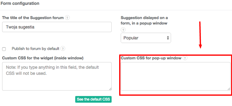 After users click your suggestions tab, they see a pop-up window prompting them to submit a suggestion. If you want to use custom CSS for this pop-up, go to Settings > Forum Configuration > Site widget and paste your CSS code in the appropriate box.
