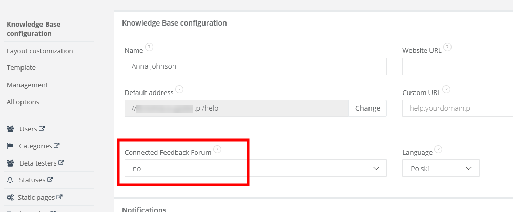 To connect two forums (both forums have to be on the same Sugester account), go to Settings > Knowledge Base Configuration and select the forum you want connected from the drop-down list.