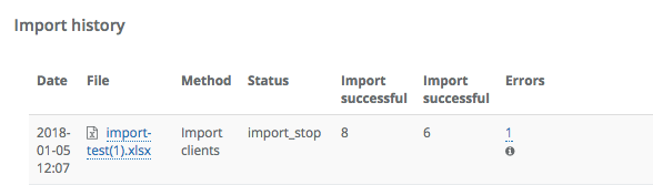 After the data has been successfully imported the system will show you a table with a history of imports. Here you will be able to check how many records were imported and if there were any errors.
