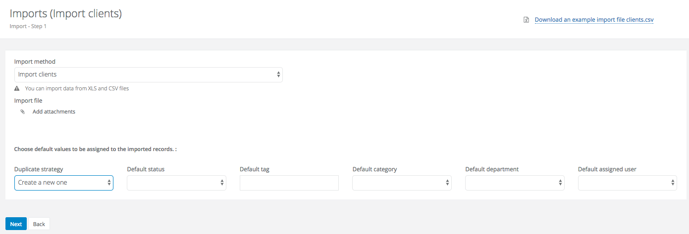 To transfer your client database from another system or to submit new entries you can use the Import option in Sugester. For this purpose navigate to Settings > Imports/Exports > New Import > Import clients