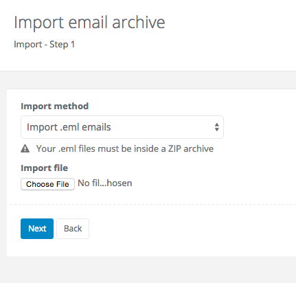 To import your email archive to Sugester, go to Settings > Import/Export > New import > Import emails. On the following screen click on Choose file, select your zipped .eml archive, and click 'next'. You're done - your emails will be available in Sugester after the archive has been processed.