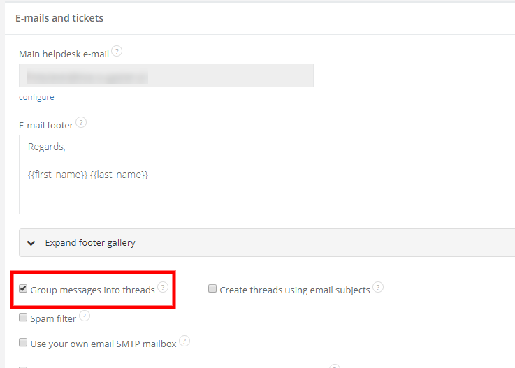 Since some users prefer to view their e-mails traditionally, this option is disabled by deafult. To enable conversation threading, go to Settings > Account settings and in the section labeled E-mails and tickets tick the box marked Group messages into threads.
