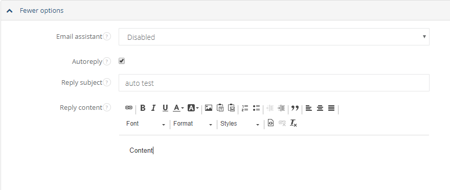 To set up automatic responses for one of your mailboxes, go to Settings > Email settings > Email boxes, choose one of your mailboxes and click on its name. You will see all the settings available for this mailbox. Scroll to the bottom to find a checkbox marked Autoreply. After ticking it, you will see two options: