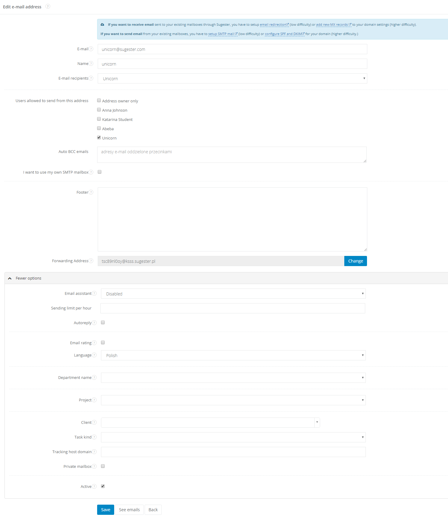 - Project - select a project to which emails will be assigned. It's especially important if you want new messages sent to this address appear in a separate folder in the left-hand inbox menu
