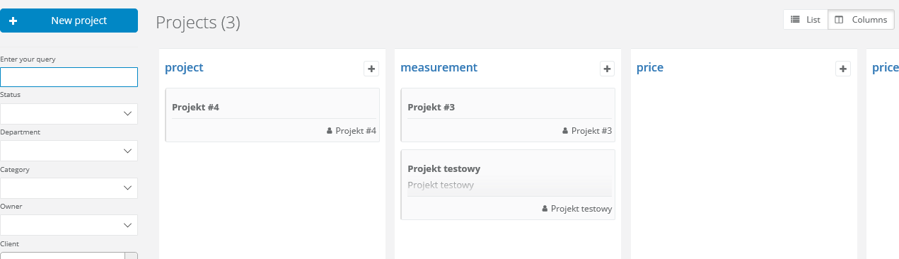 The column view of the a project allows you to visually display the individual stages on which your project is located. You can track if a project has been accepted by the client, whether a contract has been signed or whether the next stage of work related to the project has been started. You can the stages of your project, based on the status of your projects.