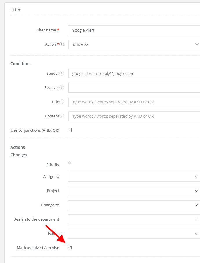To create such a filter, navigate to Settings > Automation > Macros and Filters > Add Filter and select Universal as the Type. You can find more about creating filters in the article: Filters - Assign to user; to folder; to project; to department. Change into an assignment