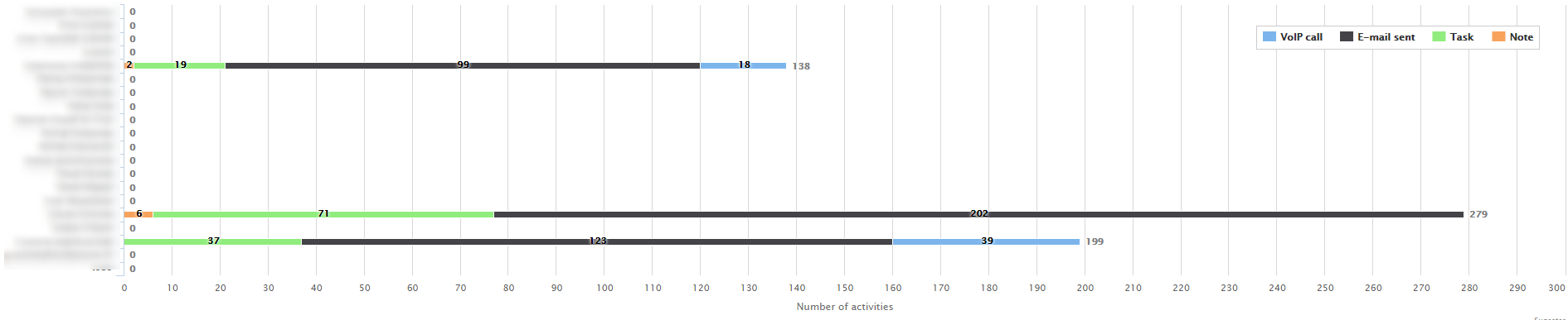 In this graph, each row represent both the number and the type of activity of a particular user. With it, you can compare the effectiveness of individual employees.