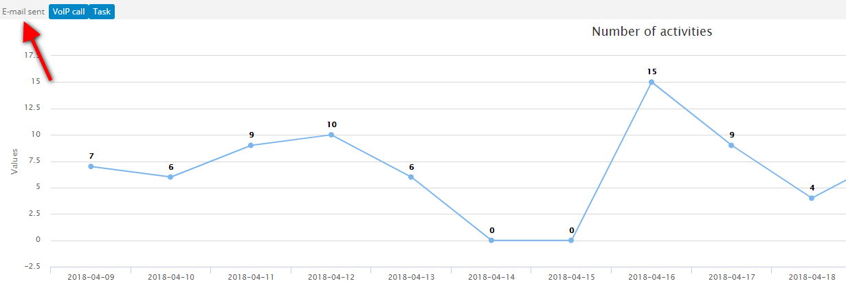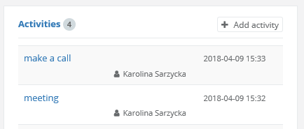On the basis of the user’s actions within the system, the following activities can be displayed: emails sent, tasks created, VOIP calls, notes added to the client and all activities which were manually added to a client’s card, i.e. meeting with the client, skype interview, etc.