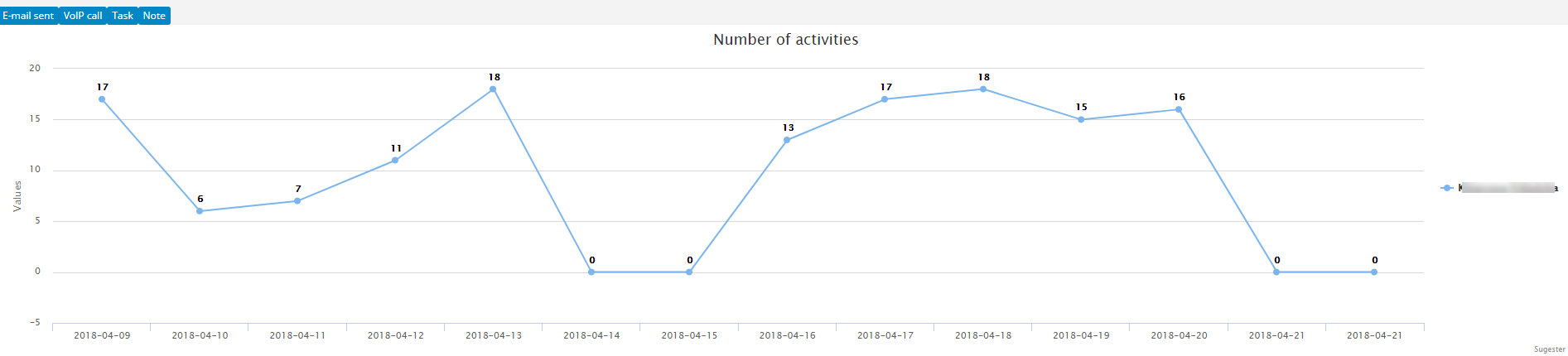 The graph will show the number of individual activities for a specified time interval. Time is displayed on the X-axis, the number of activities is set on the Y-axis. By default, the graph will display all the data for all the users, but you can always choose which activities you want to see.