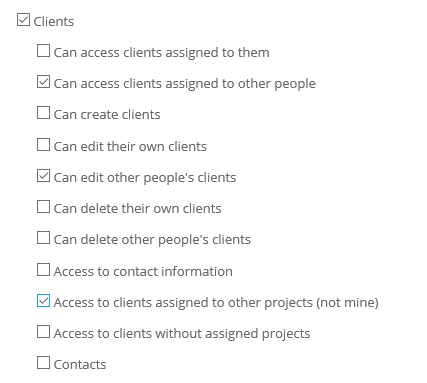 • Access to clients assigned to other projects (not mine) - the user will have access to clients who are assigned to a project that does not include the user