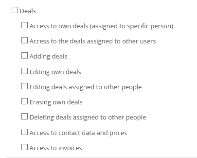• Access to deals assigned to other people - high level of access. The user will see all deals, not only those that he has added and are assigned to him, but also the deals of all other users in your account.