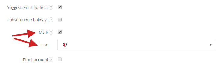To add an icon which will be visible on the list of users next to their surname, head to the user profile (Settings > Users), mark the checkbox Mark, and select the icon you want to use for that user. You can select from a default list of icons we have made available.