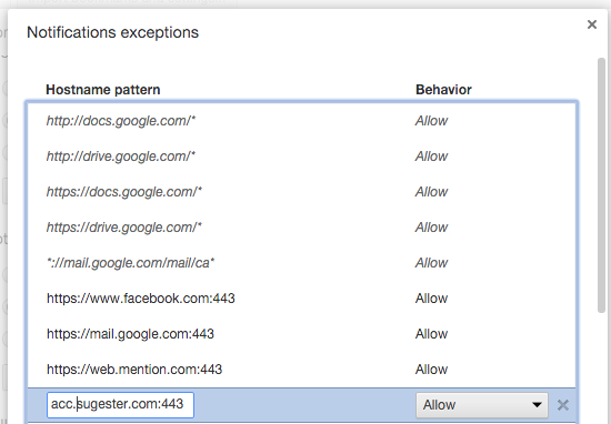 If you've already blocked push notifications, but want to re-enable them, go to Chrome's Settings, click on Show advanced settings, go to Privacy > Content settings > Notifications > Manage exceptions find your Sugester account name (ex. myaccount.sugester.com) and from the drop-down menu on its right select Allow, then click Done.