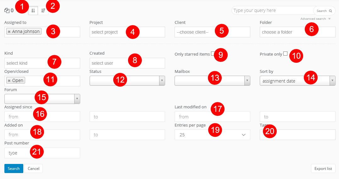 Sugester allows you to improve handling mailbox in company. Thanks to advanced search you will easily find e.g. e-mails sent by particular client, you will also find out who is in charge of assigned tasks or what the deadline is. Below you'll find description of items that can be adjust for advanced search: