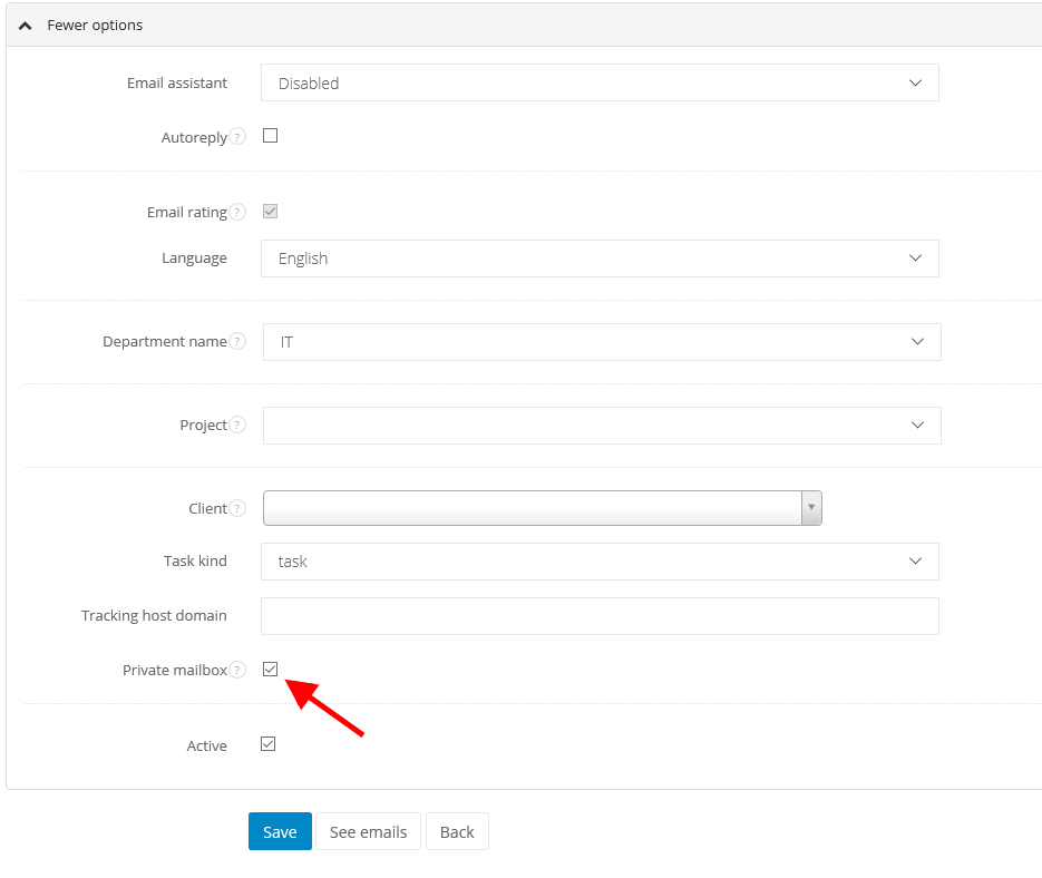 To set the mailbox as Private, select Settings > E-mails settings > E-mail boxes. At the bottom of the page select Private checkbox.