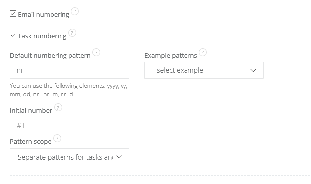 - Pattern scope - if you want to enable tasks numbering only, select 'Separate patterns for tasks and emails'. You can also merge numbering, then new emails and tasks will share numbering