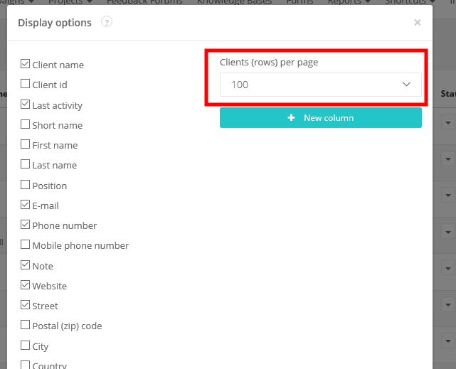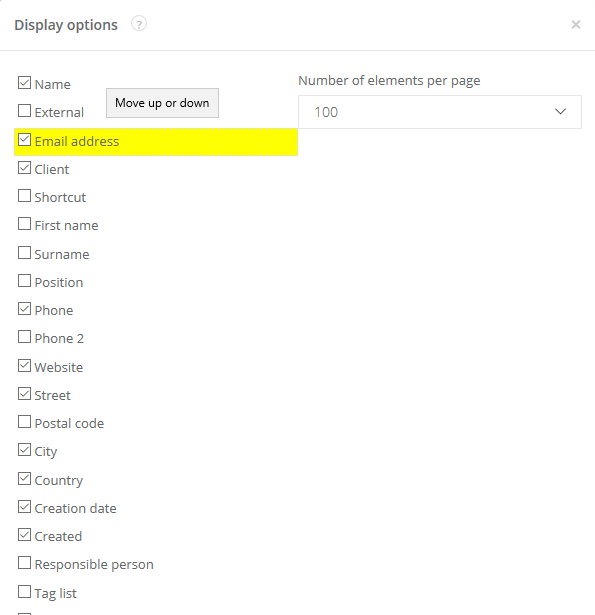 To change the order of columns in clients' database, in the top menu select CRM > Clients > click on the cog icon > Contacts. Click again on the cog icon and select Display options.