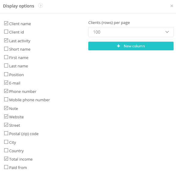Sugester enables displaying clients' list in the way you want it. Just select CRM > Clients, click on the cog icon in top right corner and click on Display options.