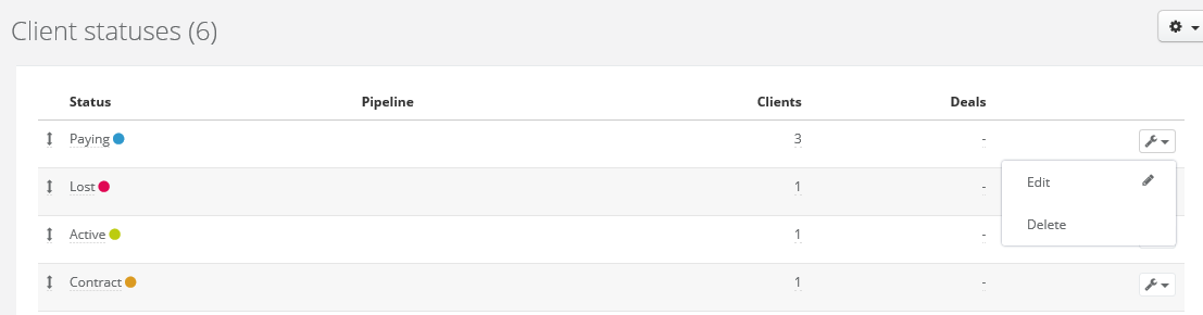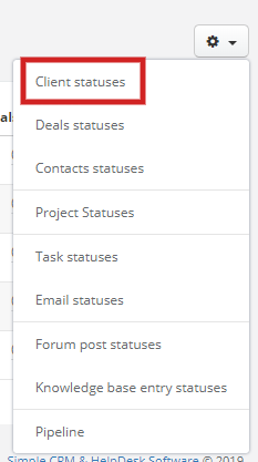 Sugester offers you 4 default clients' statuses: Contact, Potential, Paying and Lost. If you're at the beginning of your work with Sugester and you want to display default clients' statuses, select Settings > Account settings > Statuses, click on the cog icon in the top right corner and select Client statuses.Statuses on the list and in the client's profile