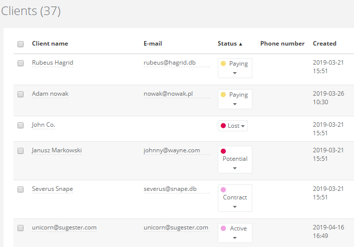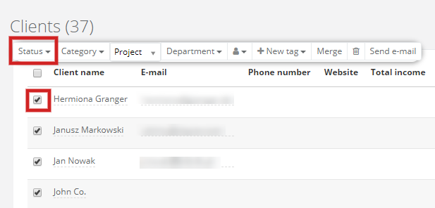 Select CRM > Clients, mark the clients, whose statuses you'd like to change, and from the top menu select another status.Adding colours to statuses