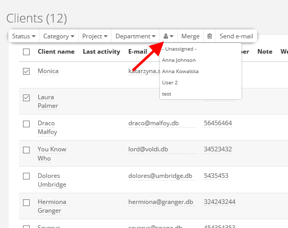 - from the list view, mark chosen clients with a checkbox and click on a person icon on the top bar