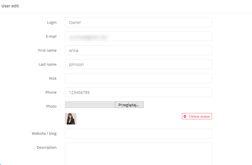 W profilu użytkownika możesz dokonać następujących zmian: In user's profile you can change following information: