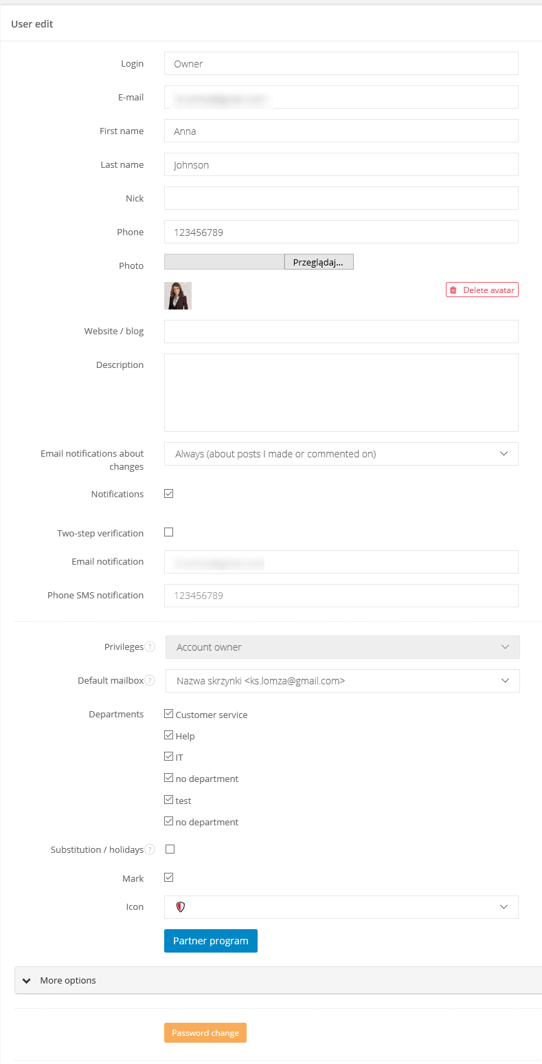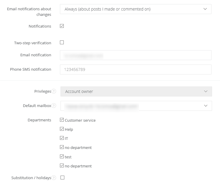 notifications - mark this feature if you want a user to receive notifications about new email/task. Notifications are also sent when someone add a new comment to a task or resolve it. After marking this checkbox you will see two new fields, where you can type notification email and phone number.