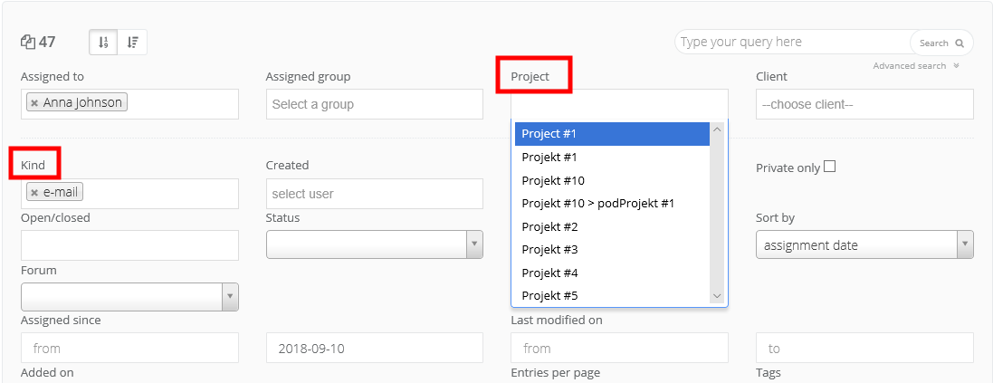 If you want to search only emails assigned to a project, you can use advanced search in Inbox. Just type the name of a project or select it from the list. In this case you can also choose from closed projects.
