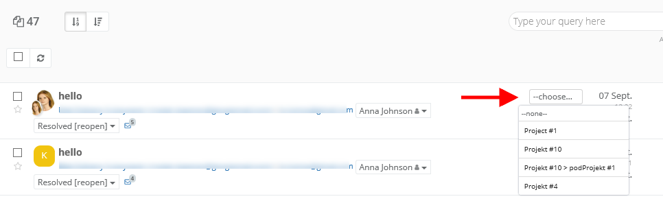You can also assign more emails to a project - just mark emails with checkbox, and from the top panel select a project. In this case you can also assign emails to open and active projects.
