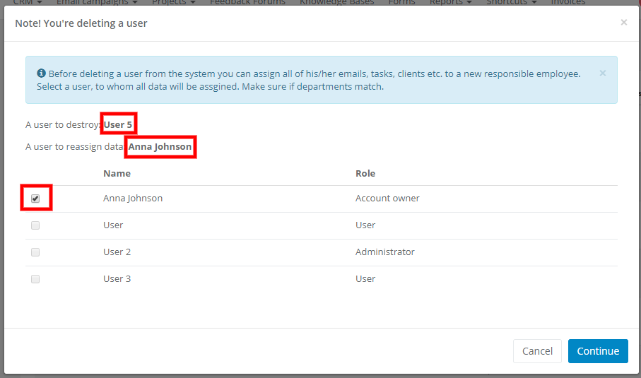 2. Possibility to reassign emails, tasks, clients etc. from one user to another while deleting one of them