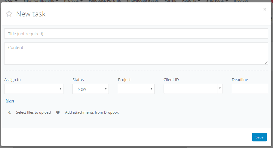 +New task. Because of the amount of fields in the pop up, some of you complained that it's too much. That's why from now on you can decide, which fields will you see. However, you have to think, which fields should stay in the window to be aprropriate for all users, because settings affects the whole account. By changing the order of fields, you can hide some of them completely, or have some of them hidden under 'More' button. For customization we give you transparent chart, where you decide about pop up window look by markjing checkboxes.