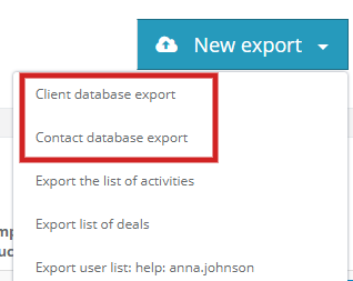 Next, click on the New export. Unfold the list and select Client database export or Contact database export.