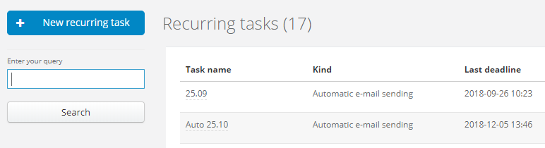 On reccuring tasks' list a new simple browser showed up, which will definitely speed up your work. If you have to find a particular task and you don't want to get through another pages, just type a phrase, or part of the phrase from the task's title. The system will show you all tasks which titles contains the phrase you typed before. Remember, that for now browsing is possible by title only, if you type in a phrase from the content, the system won't show you any results.