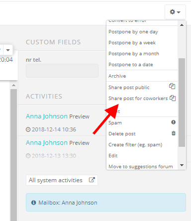 But sometimes someone outside of your department, or without access to your email box, has to have an insight into your private email, or even respond to it. In this case all you have to do is share the message with him/her. You can do it in your inbox, by clicking on the cog icon by the right side and selecting Share post for coworkers.