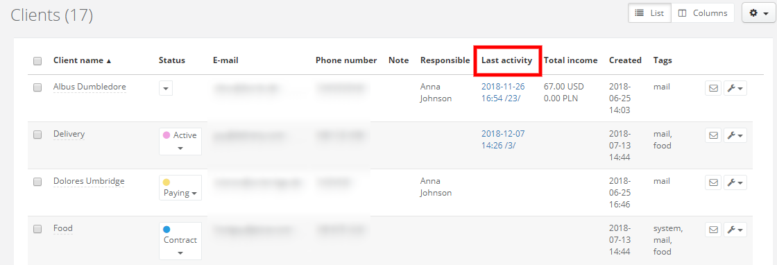 Last activity column informs you about your last contact with a client. As a 'contact' in this column we understand email correspondence (outgoing/incoming), tasks or VoIP calls (if you use VoIP module).