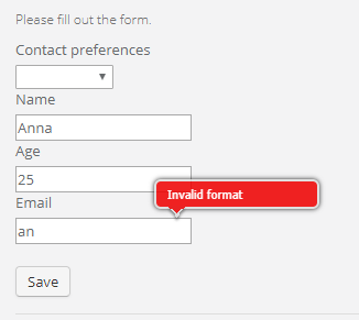 With this feature the system will check if an email address is correct. If an address is not correct, a client will see a note: