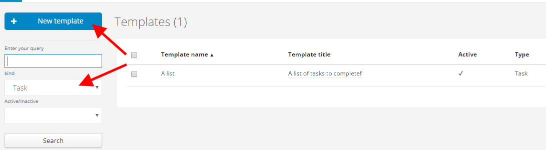 Tasks templates. From here you can add a new template by clicking on the blue button +New template or go to email templates by changing the template's kind: