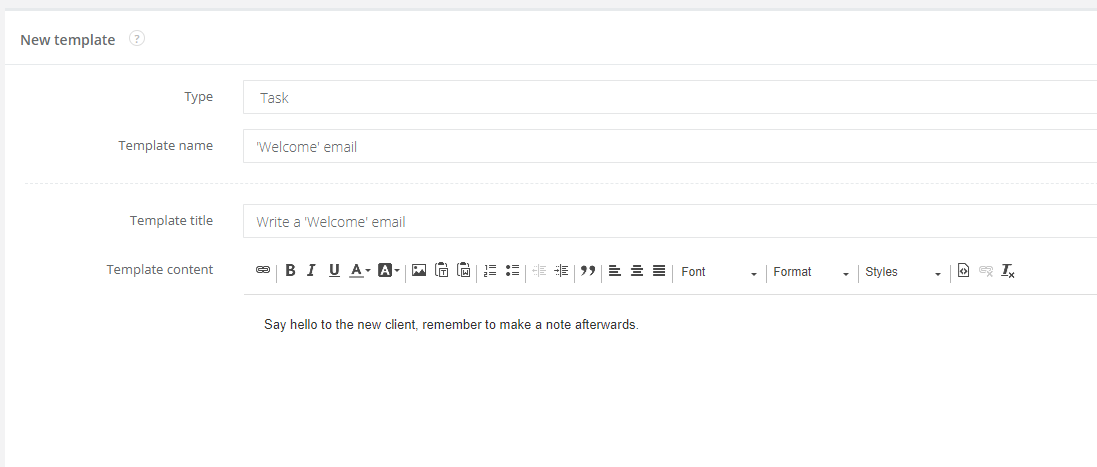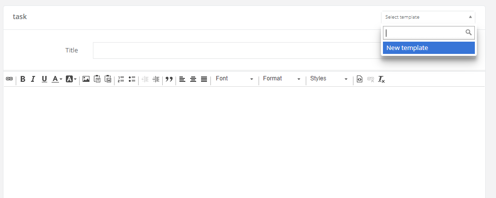 Here you can choose template's name, title and content. While filling the content, you can use the editor to make task's content clearer. You can also add a comment, screenshot or a picture.