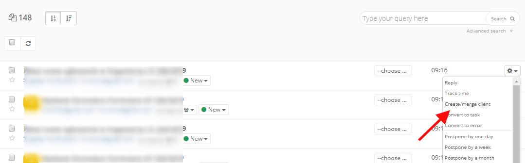To add a new client/add a new email address to an existing client, just click on the cog icon in Inbox, by the right side of an email. Next, select Create/merge client.