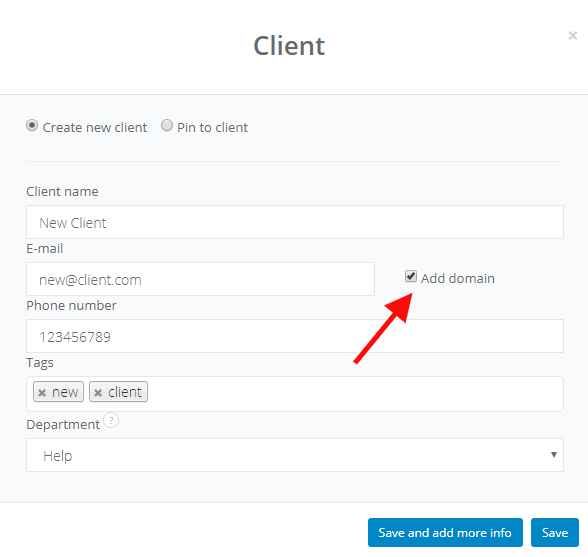 In the Create client window fill in the name, email address and phone number. If your client uses a company domain, you can also mark Add domain checkbox. The system will automatically fill the field in client's profile. If you mark Add domain, all emails from this particular domain will be assigned to the client. Also in the situation, when a client send you an email from the new address, but with company's domain. It prevents you from creating duplicated records.