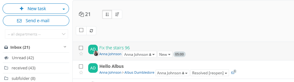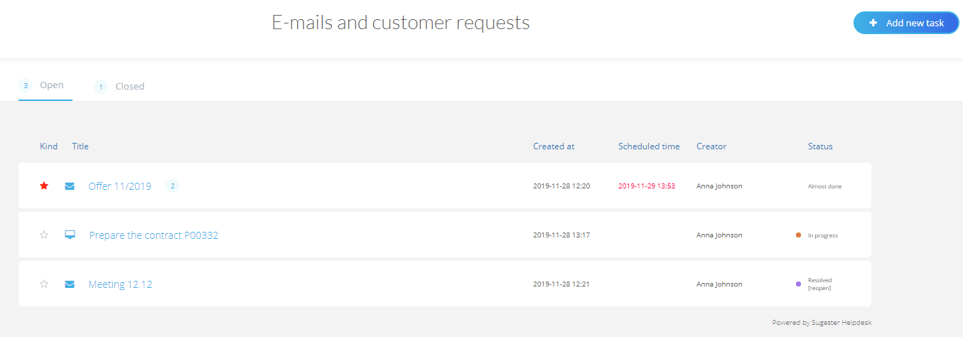 - allows you to monitor open cases or see, which ones were closed. If you mark a task as Resolved, it will be trasfered to Closed