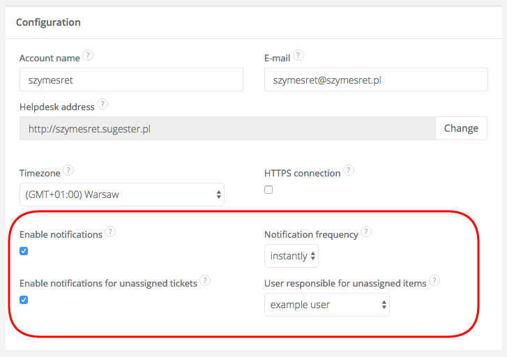 - User responsible for unassigned items - if you have enabled notifications about unassigned tickets, you can select which users on your account will receive them.
