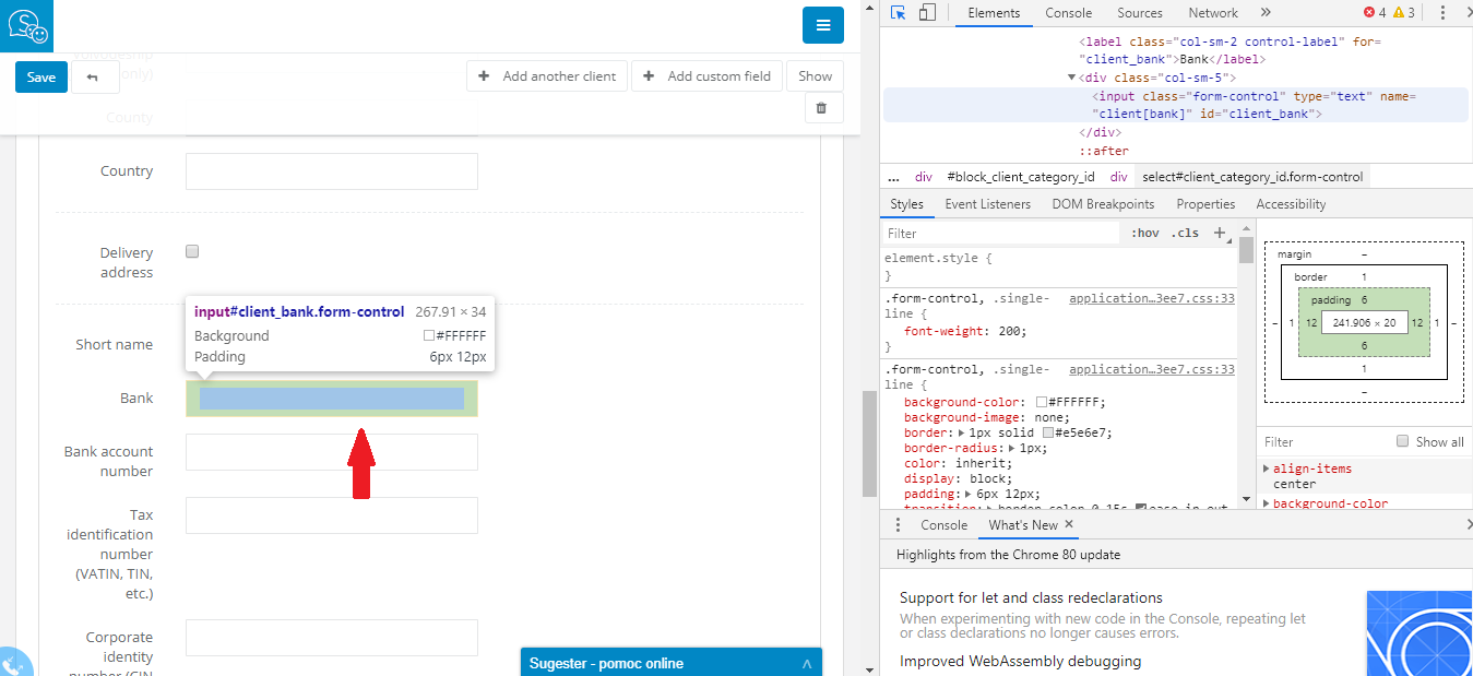 Sometimes, eg. for macros, you need to know the exact kind of custom fields in clients, deals, projects. To check that just edit client's profile, and click on the chosen field with right mouse button. Select Inspect.