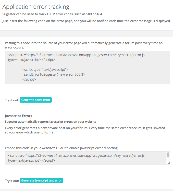 To start using Sugester's error tracking, go to Settings > Account settings > Extras > jError plugin. If you want to track HTTP errors, embed the code from the first part of the page in the HTML error page. If you want to track Javascript errors, embed the code from the second part of the page in the HEAD section of your website.
